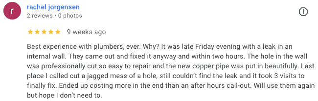 We are available when you need us! Our 24 hour service can have an plumber on-site in under 60 mins!